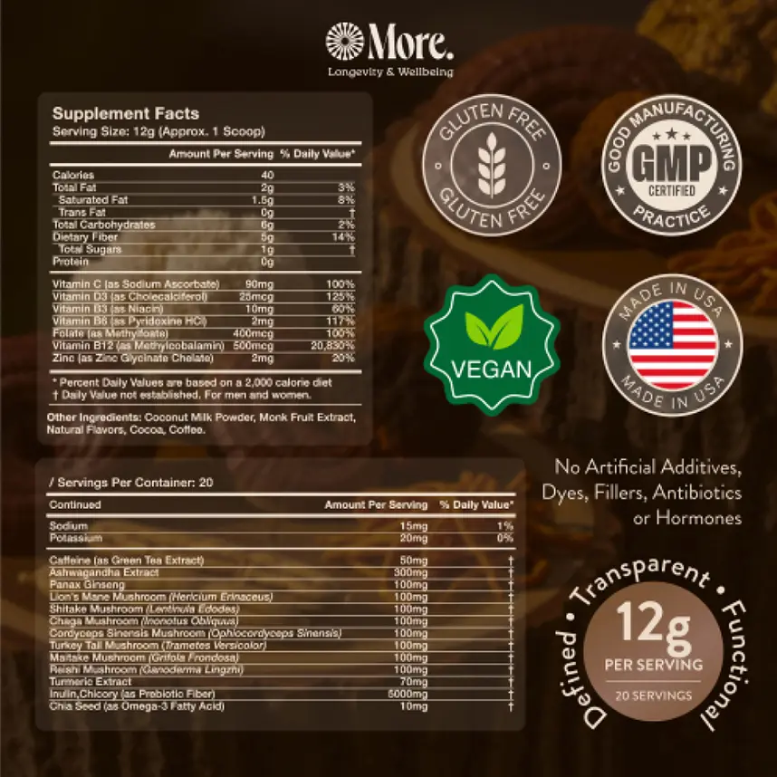 Coffee: Crafted from carefully selected, premium coffee beans to deliver a rich, full-bodied taste and natural antioxidant support. It provides a steady boost of energy and focus—without the jitters—balanced by our adaptogens and functional mushroom blend